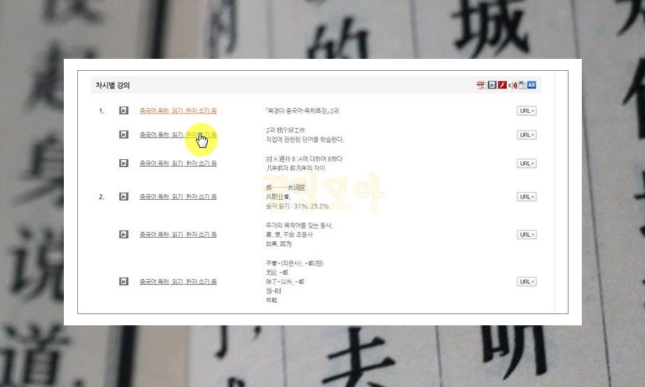 7) 중국어를 배울 때에는 발음, 읽기, 쓰기, 듣기 등 다양한 과정을 배워야 하는데요. 학습목표를 보고 자신에게 맞는 강좌나 배우기 원하는 강좌를 선택하시면 됩니다.
