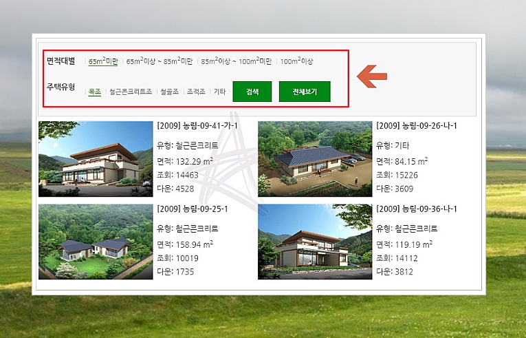 설계도 쪽으로 들어가면 크기와 유형별로 전원주택 사진모음을 보실 수 있는데요. 개성이 넘치거나 화려하진 않지만, 공공기관에서 추천하는 것이기 때문에 양질의 전원주택으로 구성되어 있습니다.