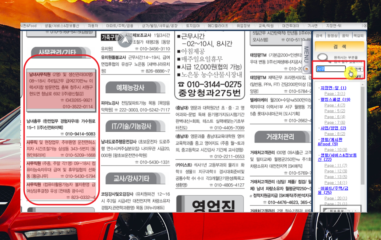 8. 너무 많은 대전교차로 구인구직 정보에서 나에게 맞는 것을 찾고 싶을 때 어떻게 하면 되는지 그 방법을 알려드리겠습니다. 우측 상단에 보면 검색 버튼이 있는데요. 해당 버튼을 누른 후 키워드 검색을 해보세요. 저는 "사무"라고 검색을 해보았는데요. 해당 문자가 포함된 구인공고에 하이라이트 표시가 되어 원하는 정보를 쉽게 찾을 수 있었습니다.