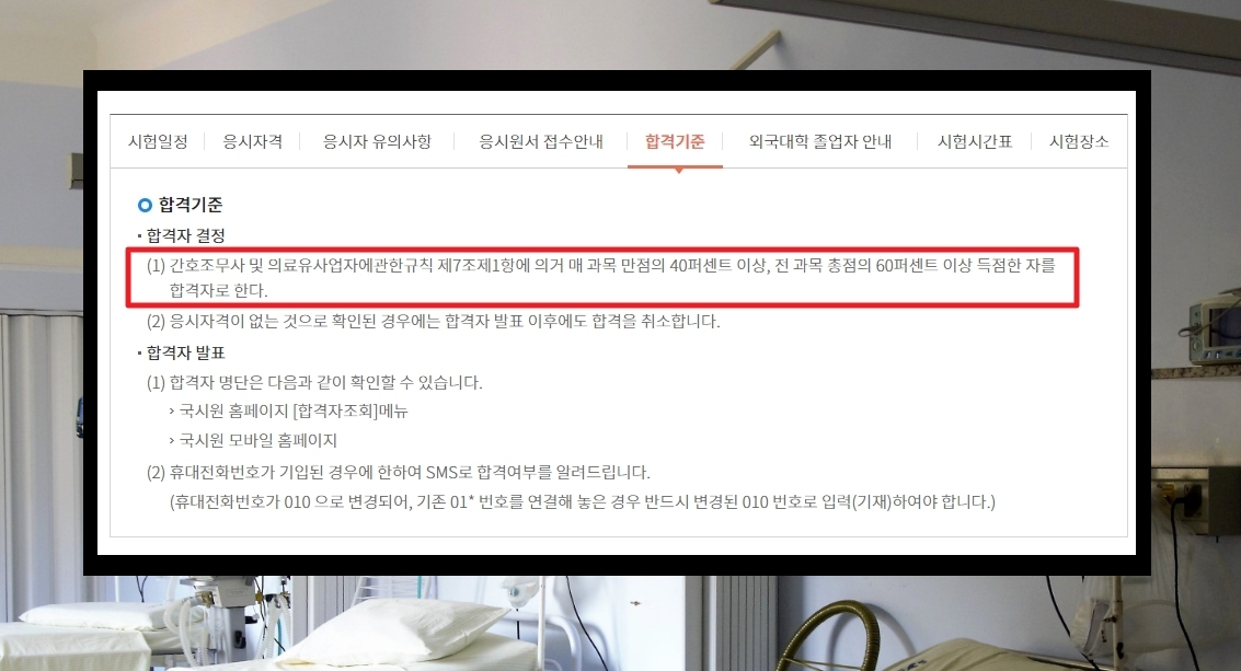 2. 매 과목 만점의 40퍼센트 이상 득점을 하고, 전 과목에서는 총점의 60퍼센트 이상 득점을 해야 간호조무사 시험에 합격을 하게 됩니다. 합격자 명단은 국시원 홈페이지에서 확인이 가능한데요. 휴대전홪번호가 기입된 경우에는 SMS로 합격여부를 알려준다고 하오니 이 점도 참고하시길 바랍니다.