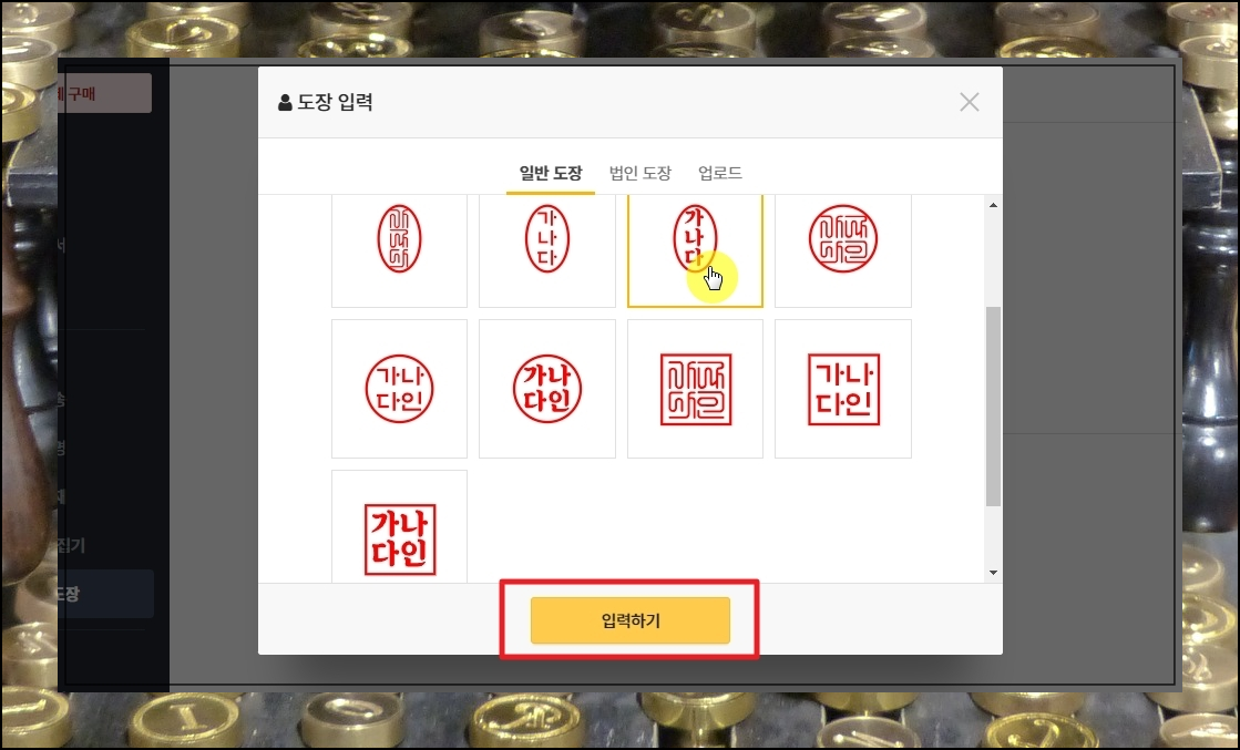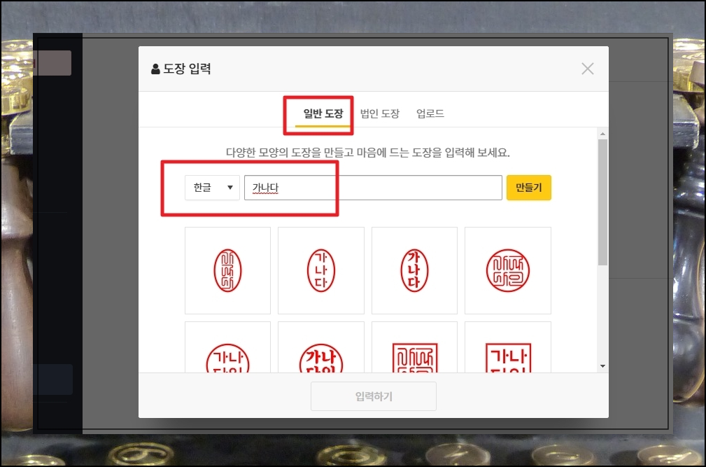 8. 새로운 창이 열리면 무료도장에 대한 이름과 설명을 입력하면 되는데요. 설명 부분은 필수가 아닙니다. 적고 싶은 분만 적어주세요. 입력을 다 하였으면 [입력 완료] 버튼을 눌러줍니다.