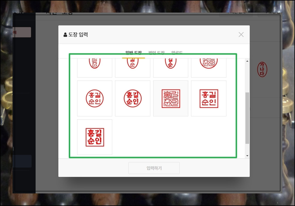 7. [만들기] 버튼을 누르면 여러 가지 디자인이 나타나는데요. 여기에서 마음에 드는 디자인을 선택한 후 [입력하기] 버튼을 누르면 됩니다.