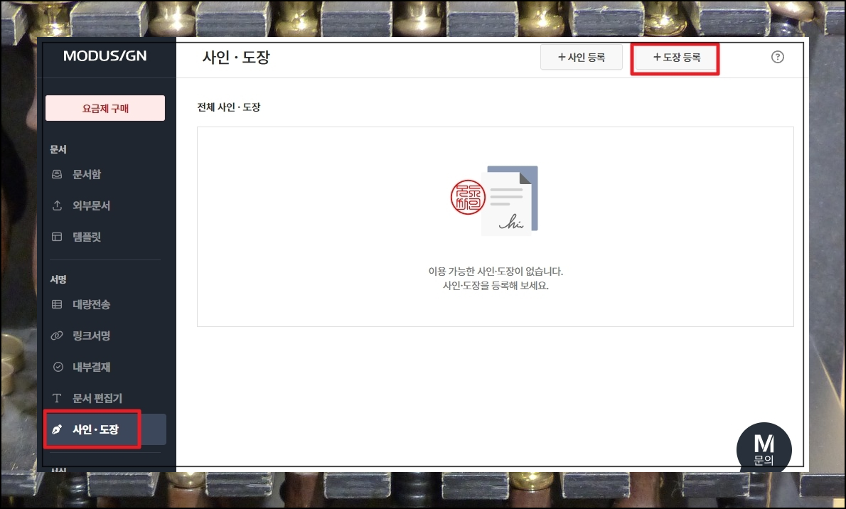 5. 로그인을 하면 다음과 같은 관리 페이지 열립니다. 여기에서 좌측에 있는 서명 카테고리에 있는 "사인과 도장" 메뉴를 선택해 주세요. 그럼 컴퓨터로 무료도장 만들기를 할 수 있는 페이지가 열립니다. 여기에서 프로그램 이용하려면 우측 상단에 있는 [등록] 버튼을 누르면 됩니다.