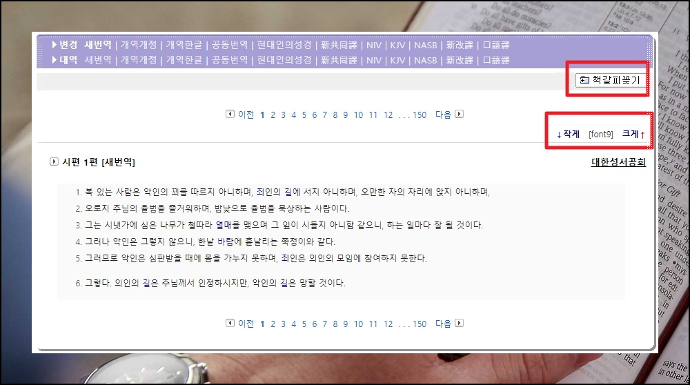사이트에서 시편 1편이 화면에 나타났는데요. 스마트폰으로 보는 경우 글씨가 작아서 잘 안 보일 수 있습니다. 이럴 때에는 우측 상단에 있는 폰트 크기를 조절하는 기능을 사용해 보세요. 또 한 가지 책갈피 기능이 있는데요. 성경읽기를 중간에 마쳤을 때 다음에 이어서 볼 수 있도록 책갈피 기능을 사용하면 됩니다.