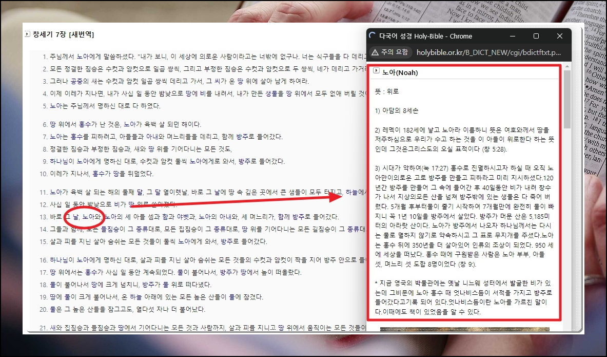 많은 사람들이 성경읽기를 진행하다가 포기하게 되는 경우는 두 가지 원인이 있는 것 같아요. 첫째는 많은 분량이고, 둘째는 의미를 알 수 없는 단어 때문인데요. 제가 이용하는 사이트에서는 이렇게 전용 사전을 펼쳐 볼 수 있습니다. 상세한 설명을 통해 일반 사람들도 종교적인 단어에 대한 의미를 파악할 수 있을 정도예요.