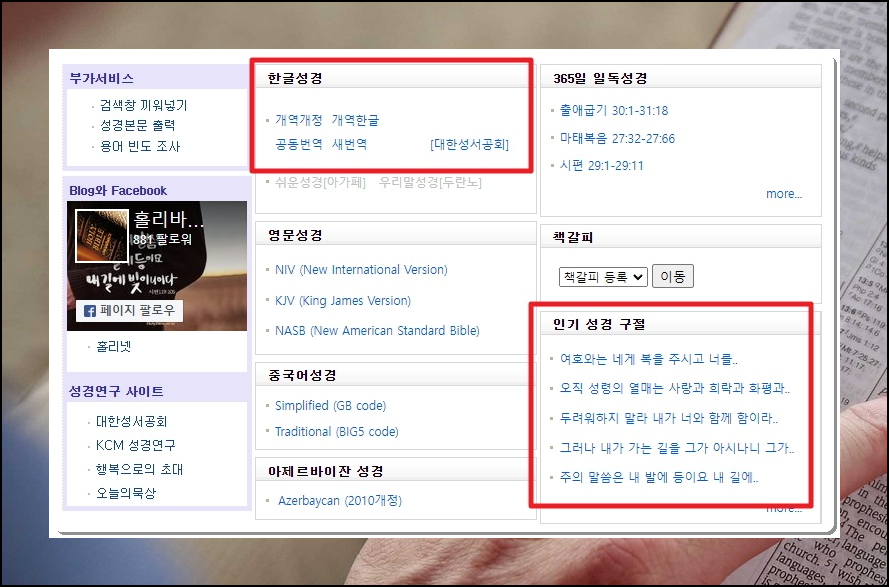 이곳에서는 한글 뿐만 아니라 외국어로도 성경읽기 가능한데요. 같은 한글로 된 서적이라도 여러 가지 버전으로 제공되고 있습니다. 직접 이용해 보고 자신에게 가장 잘 맞는 것을 선택하여 읽기를 진행하면 돼요. 그 밖에도 책갈피나 인기 구절 등 유용한 서비스가 많이 있습니다.