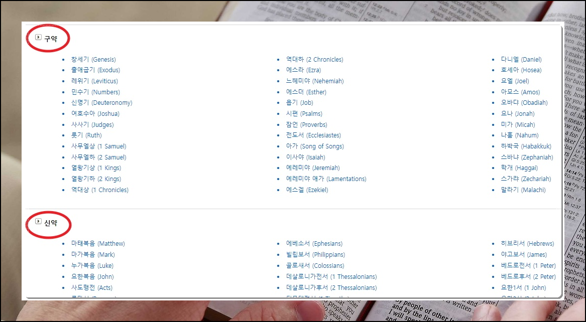 저는 한글로 되어 있는 새 번역 버전을 선택해 보았습니다. 이렇게 구약과 신약의 모든 장이 나타나는데요. 여기에서 선택하면 바로 해당 장의 첫 페이지부터 성경읽기를 시작할 수 있습니다.