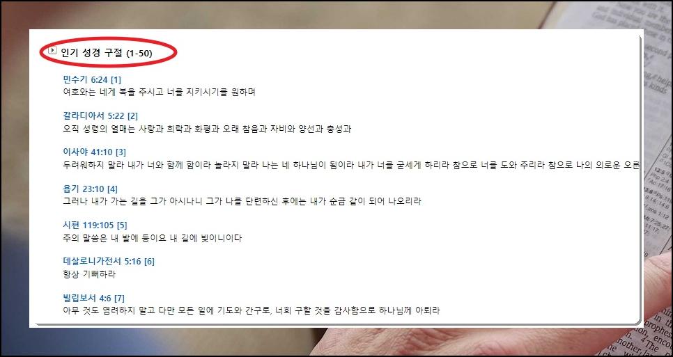 마지막으로 너무 분량이 많아 성경읽기가 버겁다고 느껴지는 분들이 계실 거예요. 그런 경우에는 해당 사이트에서 제공하는 인기 구절 서비스를 이용해 보세요. 사람들이 많이 찾는 구절로 써 의미심장한 문장이 많이 있어요. 이런 문장을 먼저 읽다보면 재미와 감동을 먼저 느낄 수 있을 것 같아요.