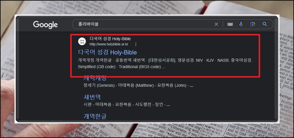 그럼 본격적으로 쉽게 성경읽기를 도와줄 사이트를 이용하는 방법에 대해 알려 드리겠습니다. 이곳의 경우에는 회원가입을 할 필요도 없고요. 누구에게나 무료로 서비스를 제공하고 있어요. “홀리 바이블” 또는 "다국어 성경"이라고 불리는 곳인데요. 검색을 통해 쉽게 접속할 수 있습니다.