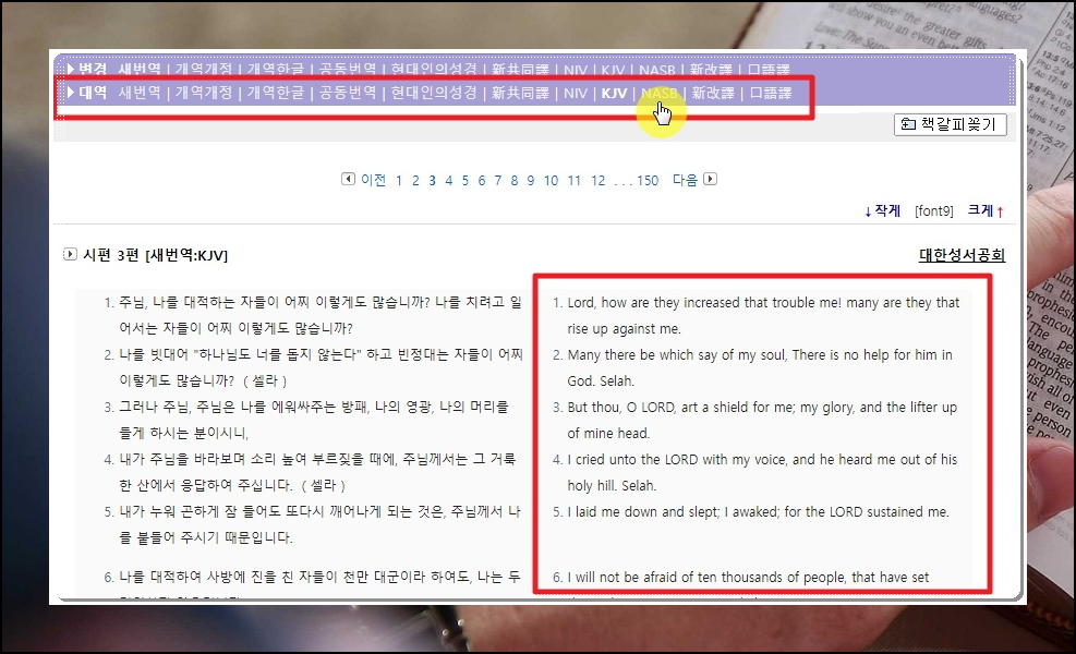 영어로 된 문장을 읽고 싶은 분들도 계실 텐데요. 그러한 경우에는 화면 상단에 있는 대역에서 NIB, KJV, NASB 중 하나를 클릭해 보세요. 그럼 좌측에는 한글로 된 성경이 나타나고 우측에는 영어로 된 문장이 나타납니다. 이렇게 함께 보면 아무리 어려운 영어 문장이라도 한글 문장을 통해 이해할 수 있어요.