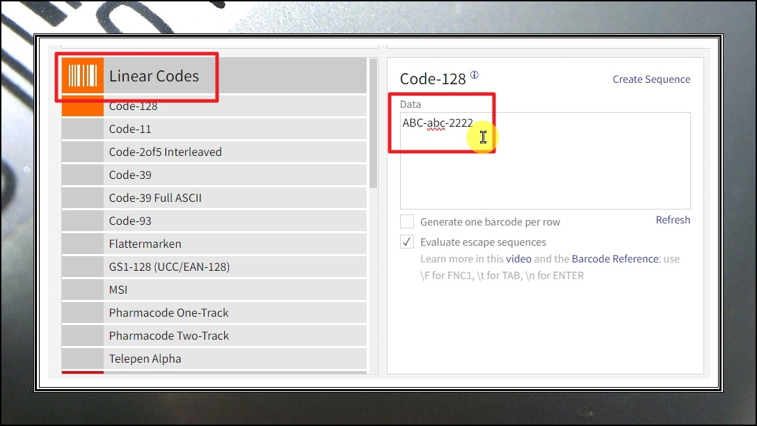 이제 하나를 생성해 보도록 하겠습니다. 일단 좌측에서 메뉴를 선택해 주세요. 여러 종류가 준비되어 있는데요. 가장 많이 사용되는 줄 모양의 바코드를 선택했습니다. 그 다음 데이터 부분에 내용을 입력합니다.