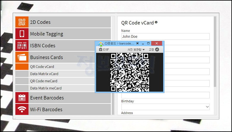 5) Wifi용 외에도 다양한 종류의 코드를 만들 수 있는데요. QR Code vCard의 경우에는 명함용입니다. QR코드를 인식하면 이름, 연락처, 이메일 주소, 직업, 생년월일, 주소 등의 정보를 제공하도록 할 수 있어요.