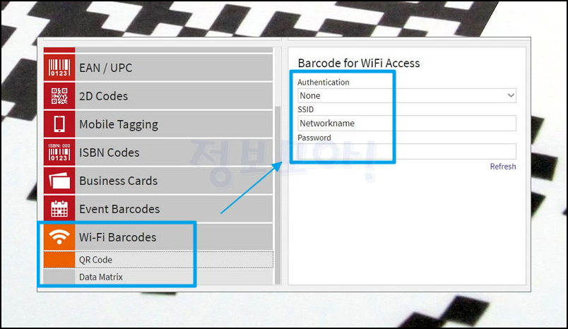 3) 앞서 말한 와이파이용 QR코드를 만들어 보겠습니다. WI-Fi Barcodes를 클릭한 후 QR Code를 선택해 주세요. 그 다음 오른쪽에 보면 포함될 내용을 입력하면 되는데요. 와이파이에 접속할 때와 동일하게 아이디와 비밀번호를 입력하면 됩니다. 굉장히 만들기 쉬워요.