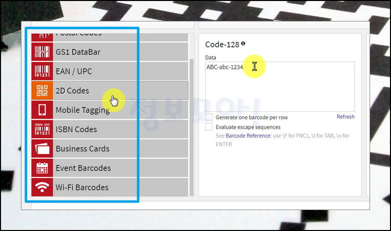 2) 맨 왼쪽을 보시면 다양한 바코드 종류가 있습니다. 카테고리를 클릭해보면 세부적으로 나뉘는데요. 만들기 원하는 것을 선택하면 됩니다. 오른쪽에 Data 부분에는 내용을 넣으면 되고요. 모두 무료로 제작할 수 있습니다.