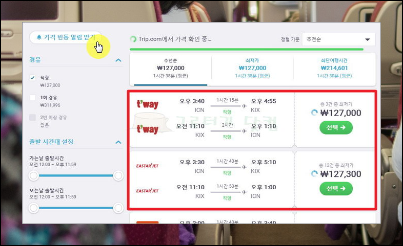 3) 마지막으로 출발 시간을 정하면 되는데요. 원하는 시간대를 이용하려면 항공권 가격이 오를 수 있습니다. 해외여행 특성상 오랜 시간 비행기를 타는 경우에는 저렴한 새벽이나 밤 비행기를 이용하는 것도 좋습니다. 현재까지 찾은 항공권의 가격이 마음에 들지 않다면 알림 서비스를 이용해 보세요.