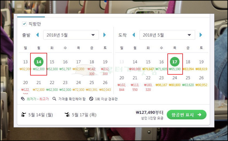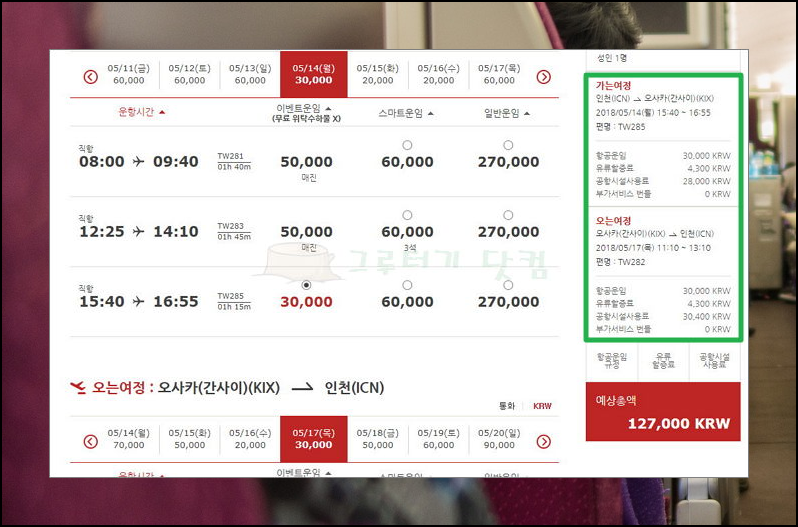 2) 달력이 나오는데요. 보통 평일에 땡처리로 판매 되는 해외여행 티켓이 많습니다. 왜냐하면 많은 관광객들이 쉴 수 있는 주말에 출발하거나 돌아오기 때문에 평일에는 판매되지 못한 해외여행 항공권이 많아서 저렴하게 판매가 되기 때문입니다. 오사카를 가는 경우에 땡처리 항공권 패키지 상품을 이용하면 절반 수준으로 가격이 떨어지네요.