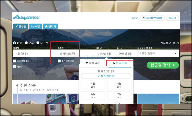 1) 항공권 가격비교 사이트를 이용하면 땡처리 항공권 패키지 상품을 쉽게 찾을 수 있습니다. 왜냐하면 모든 항공사의 티켓에 대한 정보를 비교해 볼 수 있기 때문이죠. 스카이스캐너를 통해 해외여행 땡처리 항공권을 찾아보겠습니다. 도착지와 날짜를 선택한 후 검색 버튼을 눌러주세요.
