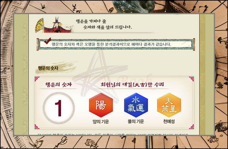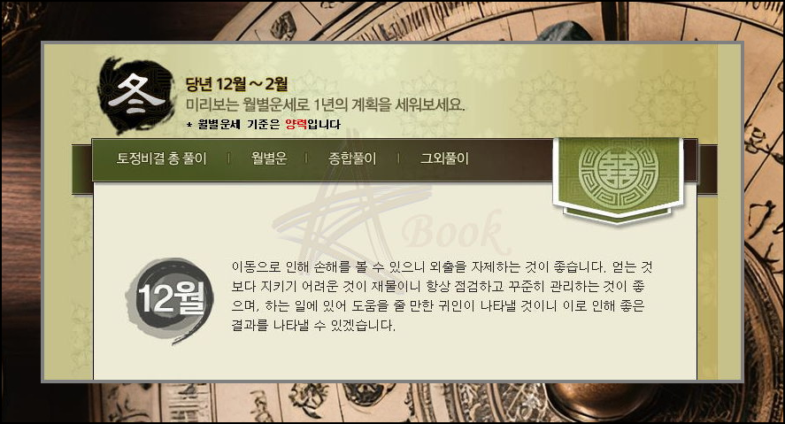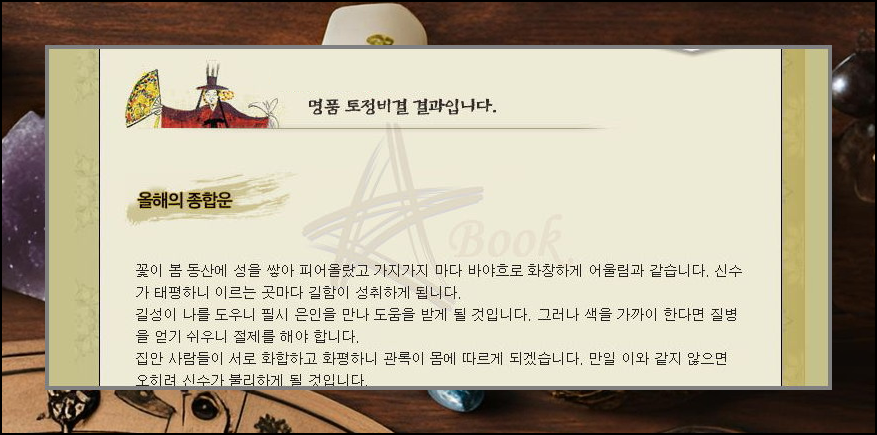 본격적으로 토정비결의 풀이 결과를 볼 수 있는데요. 올해 어떤 일이 있고, 어떻게 해야 행운이 찾아오는지에 대해 알 수 있습니다.