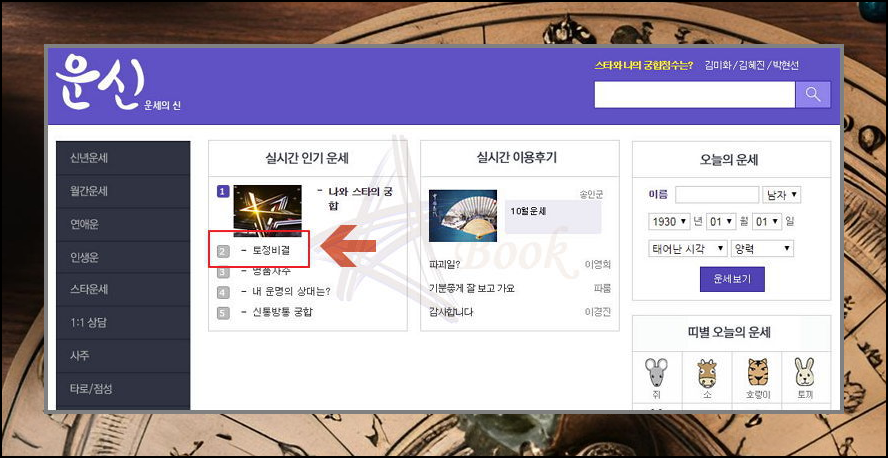홈페이지에서 사주 보는 방법은 매우 간단합니다. 메인화면에 나와 있는 실시간 인기 운세를 보면 2위에 이지함의 무료토정비결이 있습니다. 클릭해서 접속해주세요.