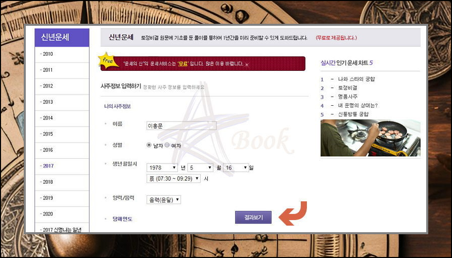 기본적으로 토정비결은 사람이 태어난 생년월일시를 기준으로 풀이가 진행되는데요. 토정 이지함 선생이 만든 이 비결은 조선시대에 잘 맞기로 소문났다고 합니다. 당해연도인 2024년은 물론이고, 내년인 2018년의 무료토정비결을 보실 수도 있어요.
