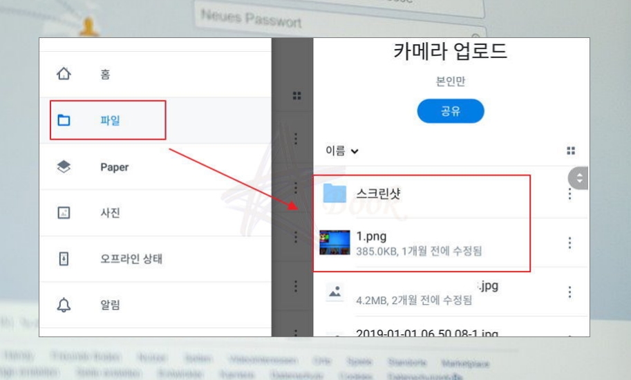 메뉴에서 파일을 눌러보세요. 휴대폰에 있는 이미지 파일이 자동으로 업로드 되고 있네요. 인터넷 저장소로 옮기는 과정인데요. 이 상태에서 컴퓨터로 사진을 열어볼 수 있어요. 휴대폰을 이용해서도 저장소에 업로드 된 이미지 파일을 열어볼 수 있고요.