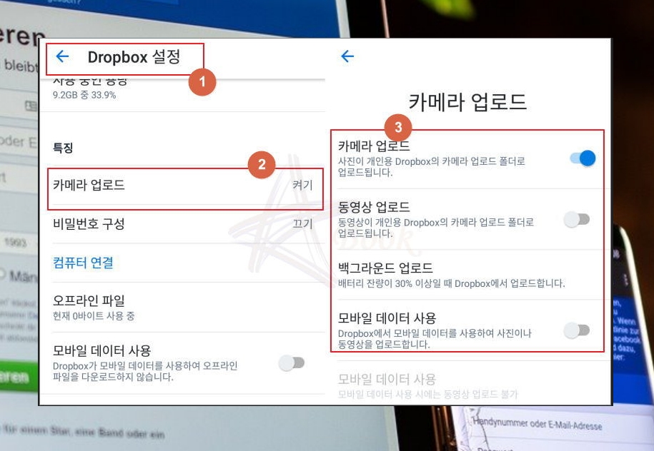 드롭박스을 통해 휴대폰 사진을 컴퓨터로 옮기는 방법은 간단한데요. 설치한 어플을 실행한 후 설정 버튼을 눌러보세요. 그럼 특징 부분에 카메라 업로드 메뉴가 있는데요. 끄기로 되어 있으면 켜기로 바꾸어 주시면 돼요. 일단 카메라 업로드는 체크해 주시고요. 동영상 촬영을 한 파일도 옮기고 싶으면 동영상 업로드 부분도 체크 해주세요.