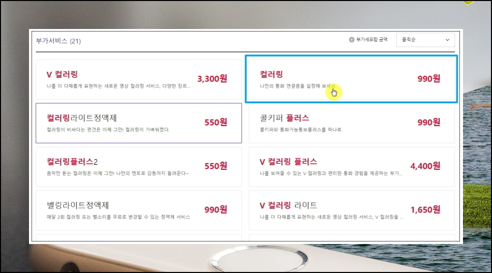 SKT의 부가서비스가 21가지나 나왔습니다. 각자 다양한 서비스를 제공하고 있는데요. 가장 기본이 되는 것은 2번째에 위치한 "컬러링" 서비스 입니다. 요금이 990원으로 부담 없이 이용할 수 있는 금액이에요. 영상으로 나오게 하거나 내가 만든 멘트를 적용하는 서비스도 SKT에서 제공하고 있으니 필요한 분들은 이용해 보는 것도 좋을 것 같아요.