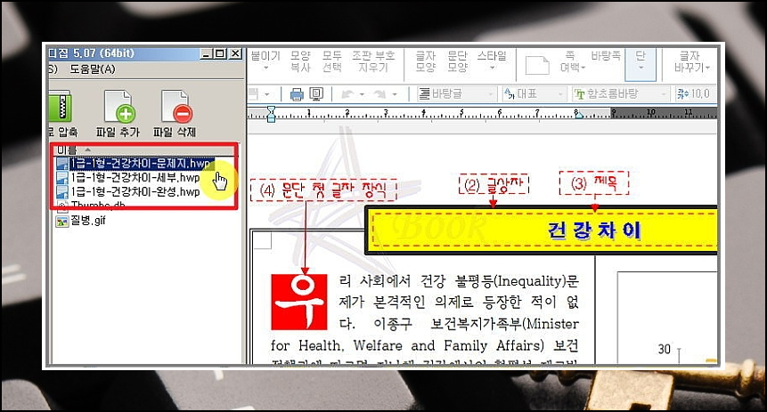 파일을 받아보면 워드프로세서 기출문제는 압축 파일로 묶여 있습니다. 알집을 통해 압축을 풀면 실기시험에 관한 파일이 나타나는데요. 첫번째 파일을 열고 실제로 실기시험을 보듯이 따라서 문서를 작성하시면 됩니다. 다 작성하시면 '완성' 파일을 열어 맞는지 확인하시면 돼요.