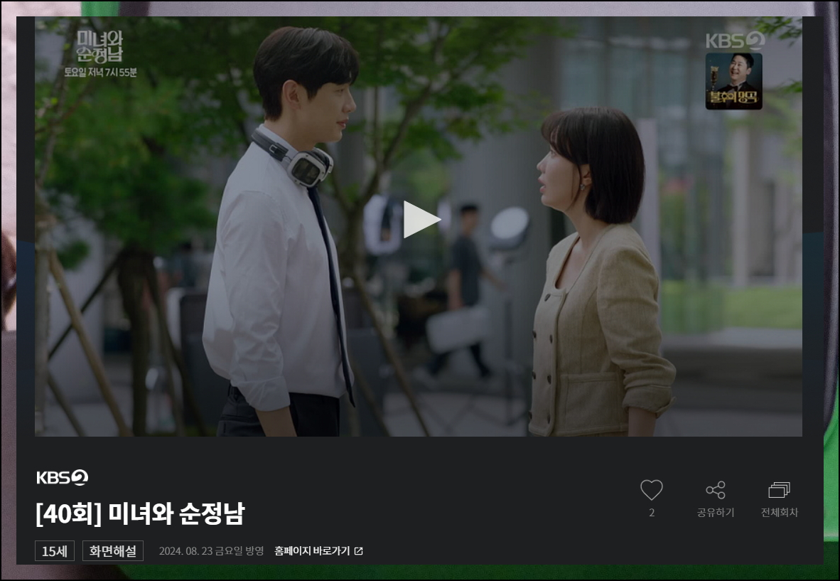저는 40회를 선택했는데요. 바로 감상할 수 있도록 비디오 플레이어가 사이트 화면에 나타났습니다. 여기에서 재생 버튼을 누르면 해당 드라마를 무료 감상할 수 있어요.