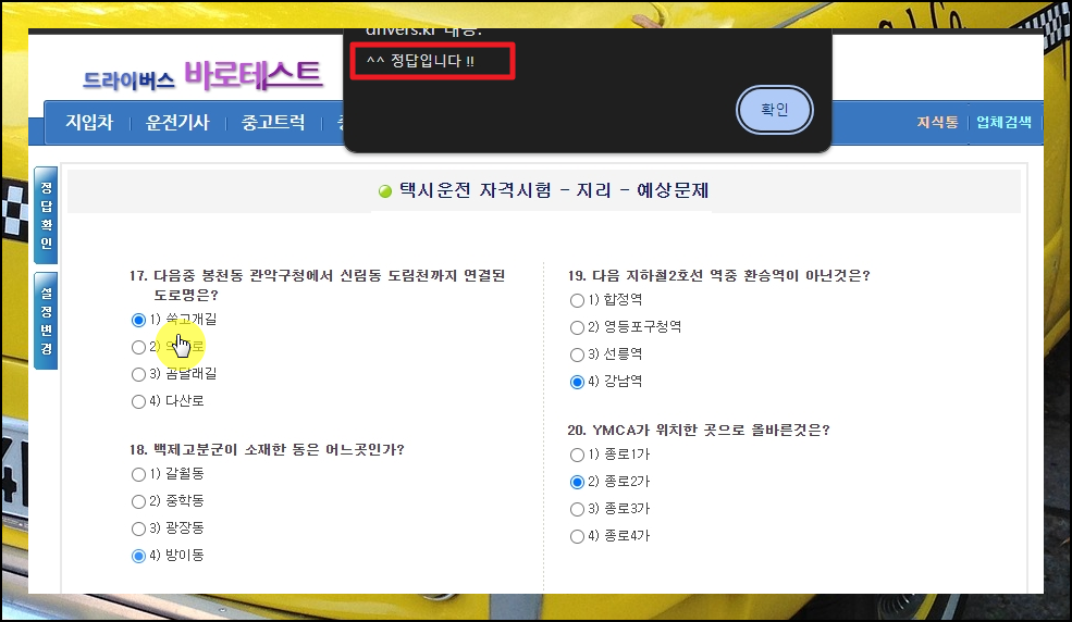 택시운전 자격시험 기출문제 화면이 나타났습니다. 각 문항의 내용을 읽어보고, 답이라고 생각이 되는 선택지를 클릭해 주세요. 그럼 해당 사이트에서 바로 정답 여부를 알려줍니다. 지리 과목의 경우에는 도로명, 지역명, 환승역, 특정 장소의 위치에 대한 내용으로 되어 있네요. 그럼 잘 푸셔서 한 번에 합격하시길 바랍니다.