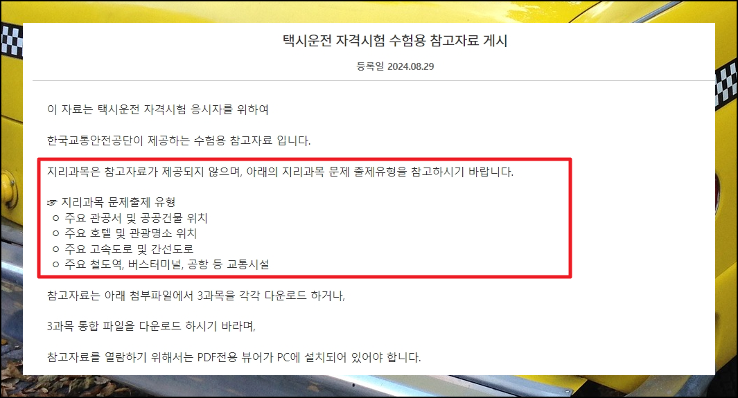 택시운전 자격시험 기출문제, 기본서 자료 무료 이용하기.