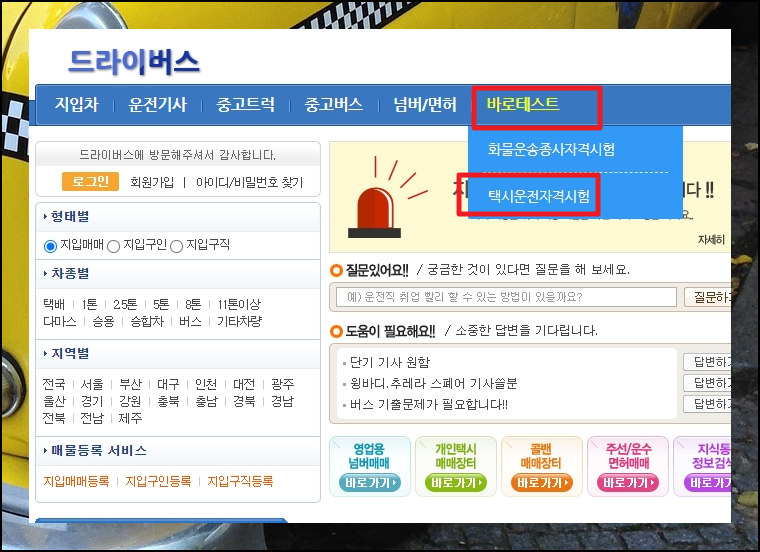 그럼 기출문제 풀이를 위해 인터넷 사이트에 접속하겠습니다. 바로 "드라이버스"라는 곳을 접속하면 되는데요. 누구나 무상으로 이곳에서 택시운전 자격시험 기출문제를 풀어볼 수 있습니다. 사이트에 접속하면 "바로테스트" 메뉴를 클릭해 보세요. 그럼 하위 메뉴에 "택시운전" 항목이 나타납니다. 메뉴를 선택해 주세요.