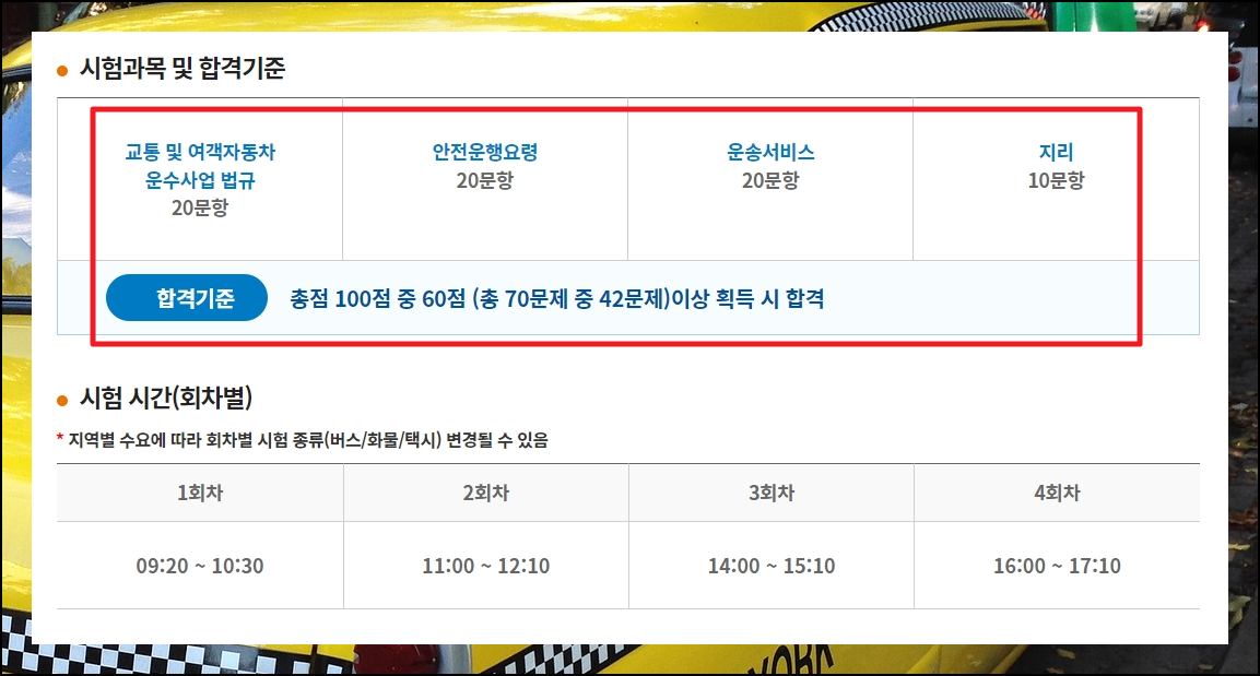 합격기준을 보면 총점 100점 중 60점 이상을 맞으면 합격이라고 되어 있는데요. 각 과목마다 출제가 되는 문항의 수가 다릅니다. 지리의 경우에는 10문항인데요. 그만큼 택시운전 자격시험 준비를 할 때 이러한 것을 반영하여 학습시간 분배를 잘하는 것이 좋습니다. 주어지는 시간도 어느 정도인지 확인 후 택시운전 자격시험 모의고사를 풀 때 활용하면 좋아요. 실전과 같은 상황에서 모의고사를 보는 것이 효과가 좋습니다.