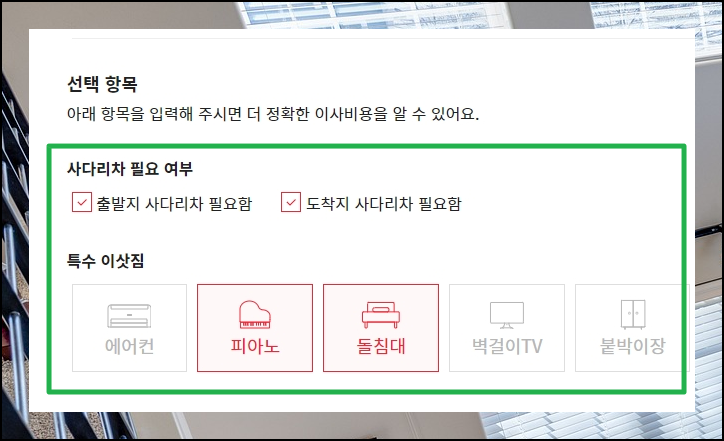 이번 단계는 선택 항목에 해당하는 것인데요. 해당 사항이 있는 경우에만 선택하면 됩니다. 아무래도 고층에 살고, 고층으로 짐을 옮겨야 되는 경우라면 사다리차가 필요한데요. 엘레베이터로 대신할 수 없는 경우에는 출발지 또는 도착지에 사다리차가 필요하다고 선택해 주세요. 그리고 특수 이삿짐이 있으면 추가 비용이 발생할 수 있는데요. 여기에 해당하는 것으로는 무거운 돌침대를 시작으로 변걸이TV, 붙박이장, 에어컨, 피아노가 있습니다.