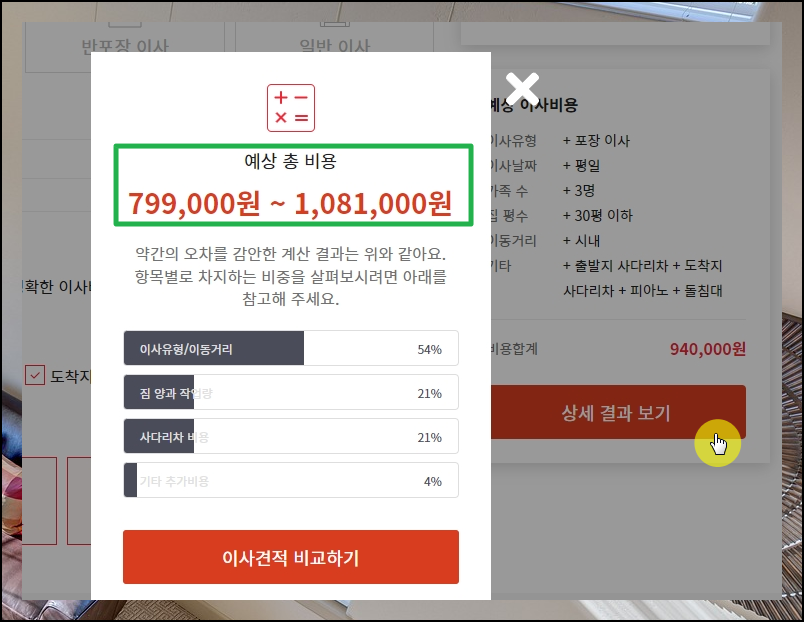 제가 방금 1분 만에 받아본 포장이사 비용 견적 결과입니다. 대략적으로 94만원 정도 나왔는데요. 해당 금액은 예상값이기 때문에 어느 정도 오차가 있을 수 있습니다. 그렇기 때문에 최소 및 최대 금액을 참고하면 좋아요. 그리고 해당 금액에서 어떤 부분이 많은 비중을 차지했는지 알 수 있는데요. 제 경우에는 포장이사를 선택한 것과 이동거리가 먼 것이 가격 상승에 높은 영향을 주었네요.