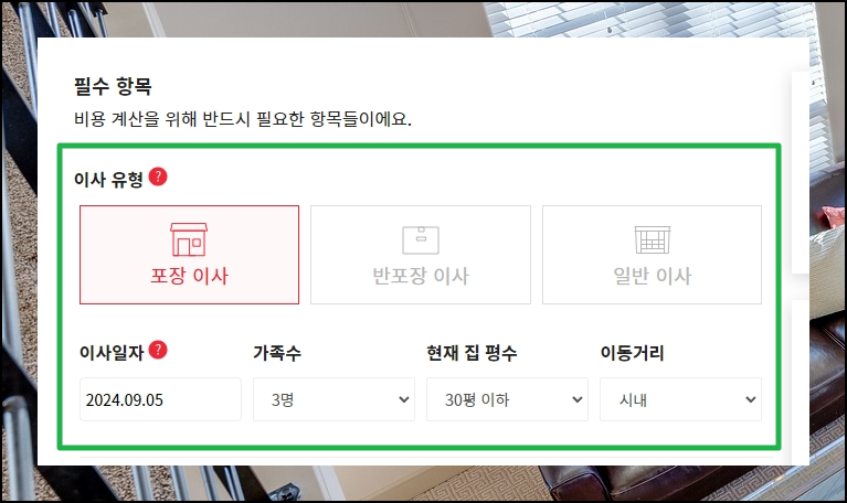비용 계산기에 대한 사용법은 간단합니다. 일단 유형 부분은 "포장이사"를 선택해 주세요. 다른 유형도 선택 가능합니다. 그 다음 이삿짐 옮기는 날짜, 가족의 수, 현재 집의 평수, 이동하는 거리에 대한 항목을 입력해 주세요. 여기까지는 필수로 입력해야 하는 부분이기 때문에 꼭 입력해야 포장이사 견적을 받아볼 수 있습니다.