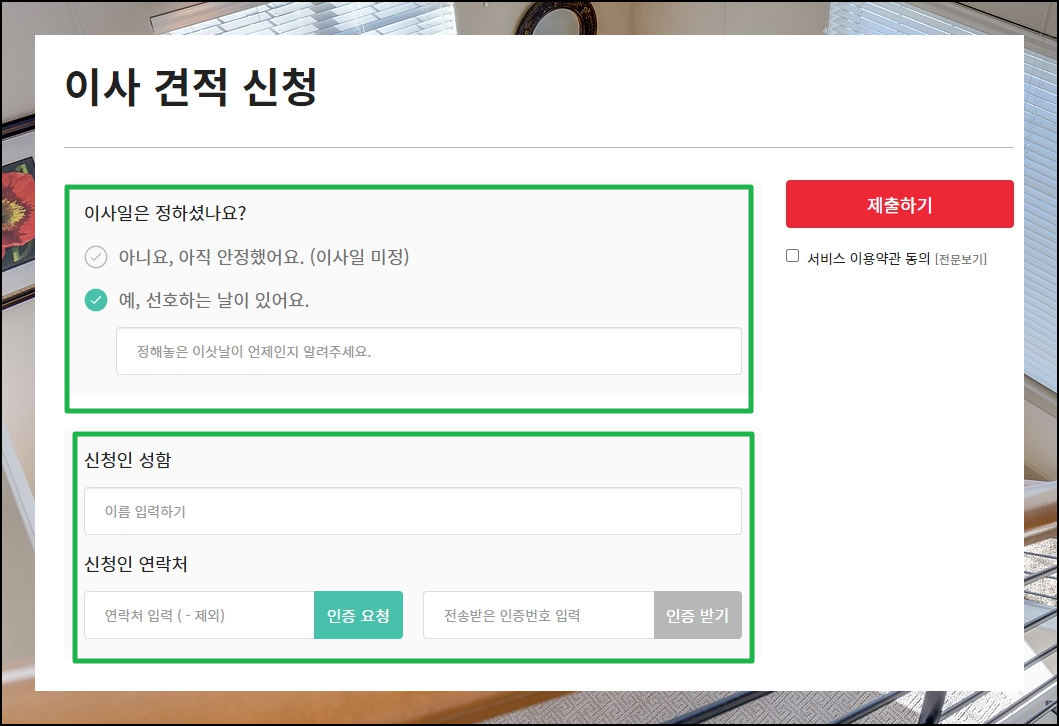 [견적 비교하기] 버튼을 누르면 실제 업체로부터 견적을 받을 수 있도록 할 수 있는데요. 날짜, 신청인 정보, 필요한 서비스 유형을 선택한 후 [제출하기] 버튼을 누르면 됩니다. 일정기간 동안 짐을 보관하는 서비스도 제공되고, 빠른 견적 받기 요청도 가능합니다.