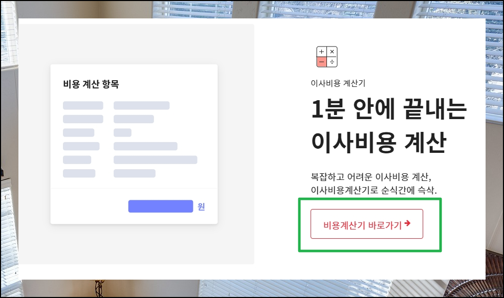 그럼 즉각적으로 나에게 맞는 포장이사 비용을 알아볼 수 있는지 그 방법을 알려드리겠습니다. 일단 app24moa 닷컴 사이트에 접속해야 하는데요. 이곳에서 제공하는 비용 계산 프로그램을 이용하면 됩니다. 빠르게 견적을 받고 싶거나 금액만 알아보고 싶을 때 이용하면 정말 좋아요. 그럼 사이트에 접속한 후 스크롤을 내려 [계산기 바로가기] 버튼을 찾아서 클릭해 주세요.