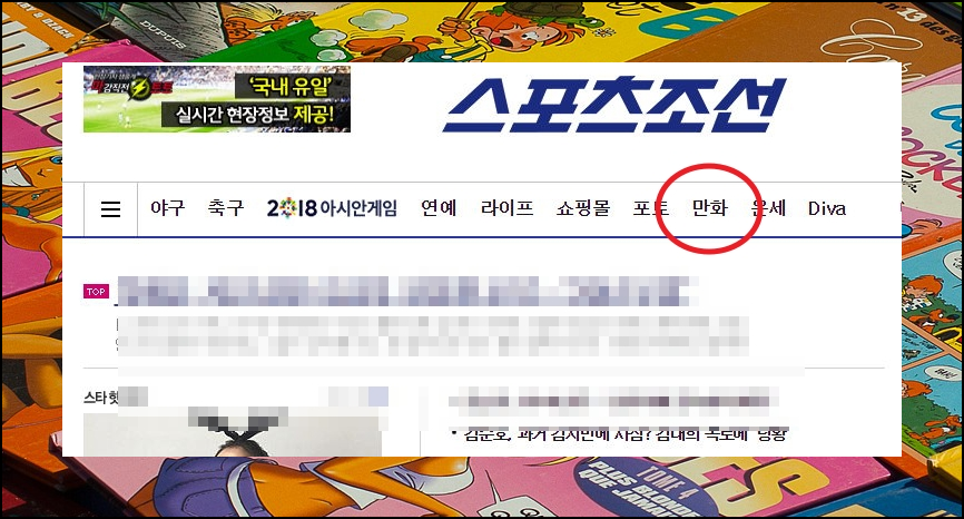 스포츠 신문 사이트 답게 야구, 축구, 아시안게임은 기본이고, 연예, 쇼핑, 운세, 만화 등의 컨텐츠를 다루고 있는데요. 무료만화는 메뉴에서 우측으로 8번째에 있는 만화를 클릭하면 만나볼 수 있습니다.