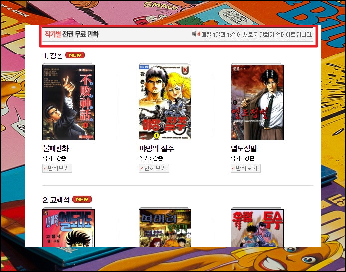 대부분 우리나라 작가들의 작품인데요. 장르는 무협, 액션, 코믹 등 다양합니다. 작품을 감상하는 방법은 간단한데요. 마음에 드는 작품을 찾으셨으면 클릭해주세요.