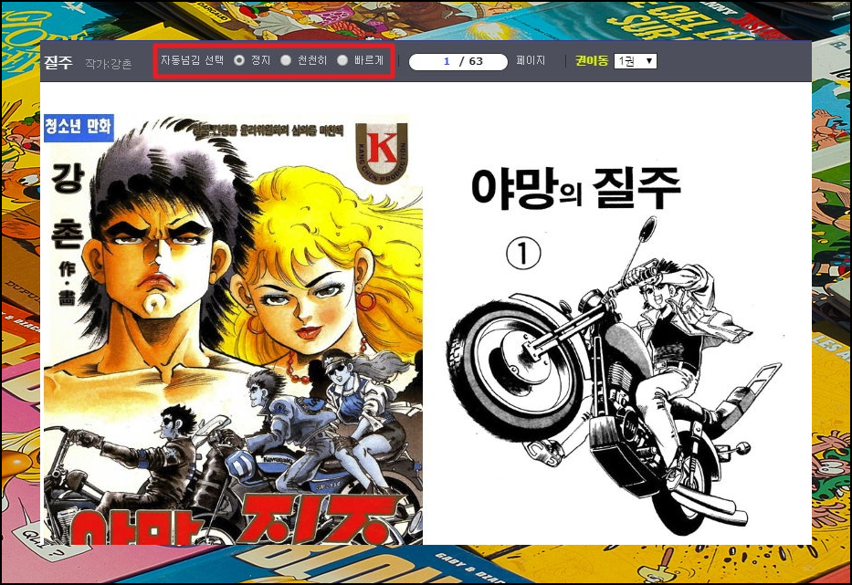 새로 열린 페이지를 통해 작품을 감상할 수 있는데요. 스포츠조선 사이트에서 오른쪽 페이지를 클릭하면 다음 페이지로 이동하고, 왼쪽 페이지를 클릭하면 이전 페이지로 이동합니다. 이렇게 일일이 클릭하면서 보기 힘들다면 자동넘김 기능을 이용하실 수도 있는데요. 메뉴에서 "천천히", 또는 "빠르게"를 선택하시면 원하는 속도로 만화를 자동넘김하면서 감상할 수 있습니다.