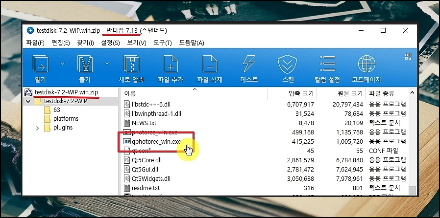 이곳에서 다운 받은 파일은 압축이 되어 있습니다. 알집이나 반디집 프로그램을 통해 압축을 해제합니다. 해제하면 여러 개의 파일이 나타납니다. 여기에서 qphotorec_win 실행 파일을 더블 클릭하면 됩니다.
