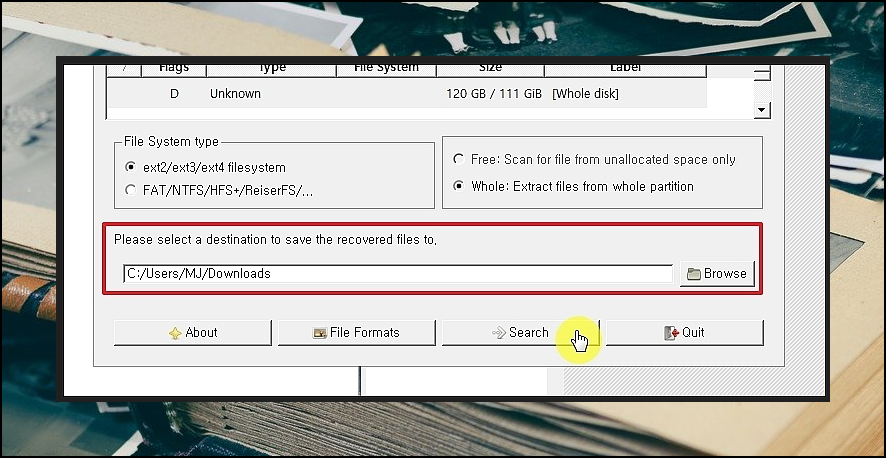 마지막으로 스마트폰 사진 복구가 완료된 이후 되살아난 파일을 저장할 폴더를 지정합니다. 지정 방법은 간단합니다. [Browse] 버튼을 클릭한 후 폴더를 지정하면 됩니다. 여기까지 설정을 하는 방법 입니다. 설정을 다하셨다면 [Search] 버튼을 눌러 사진 복구방법의 마지막 단계를 진행하면 됩니다.