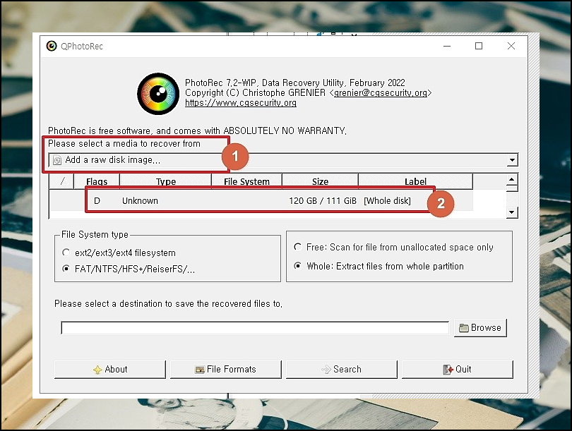 본격적으로 photorec 프로그램을 이용한 스마트폰 사진 복구방법을 알려드리겠습니다. 프로그램이 실행되면 가장 먼저 해야 하는 일은 디스크 선택입니다. 스마트폰을 컴퓨터와 연결한 후 Photorec 프로그램을 통해 디스크 선택을 해줍니다. 디스크 정보를 확인하여 이에 맞는 File System type를 선택합니다.