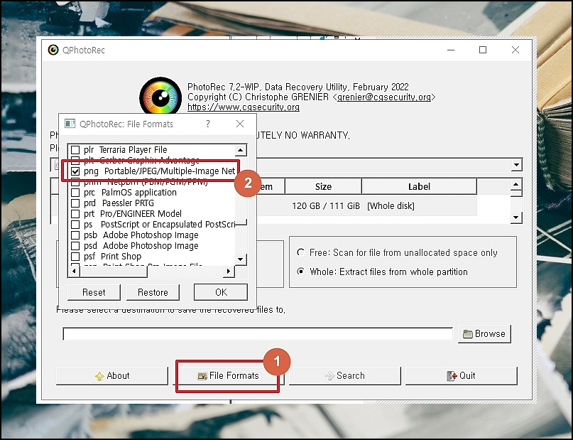 이번에는 파일 포맷을 선택할 차례입니다. 스마트폰 사진의 경우 보통 png, jpg, bmp로 되어 있습니다. 정확하게 스마트폰 사진 파일의 확장자가 어떠한 것인지 모르겠다면 모두 체크해도 됩니다. [File Formats] 버튼을 클릭하면 선택할 수 있는 확장자가 나옵니다. 확장자별 설명도 있으니 참고하시길 바랍니다.