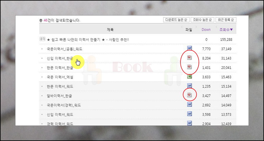 카테고리를 선택하면 이력서 양식 리스트가 나타나는데요. 파일 부분을 보시면 doc, hwp, xls 포멧을 의미하는 아이콘이 보이실 거에요. hwp 파일을 받으려면 아래아 한글 아이콘이 표시되어 있는 게시물을 선택해 주세요.