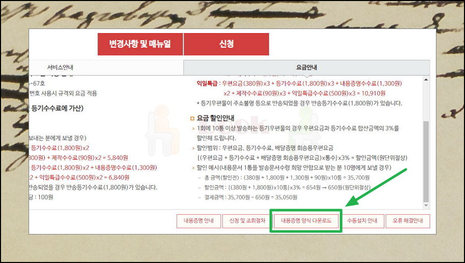 내용증명 페이지에서는 사이트의 문서 편집 프로그램을 이용하여 바로 작성하고, 수수료를 결제하면 바로 발송을 할 수 있어요. 요금 안내 아래쪽을 보시면 내용증명 무료서식 다운을 할 수 있는 버튼이 있어요. 클릭해 볼게요.