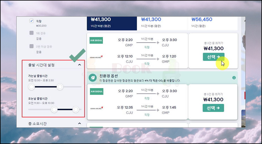 6. 원하는 시간대로 맞춤 검색해보세요. 특정 시간대에는 꼭 출발해야 하는 경우가 있어요. 그럴 때에는 좌측에 있는 가는날과 오늘날의 출발 시간을 조절해 보세요. 중앙에 있는 국내선 항공편 리스트가 갱신이 되는데요. 여기에서 예매하고 싶은 항공편을 선택해 주세요.