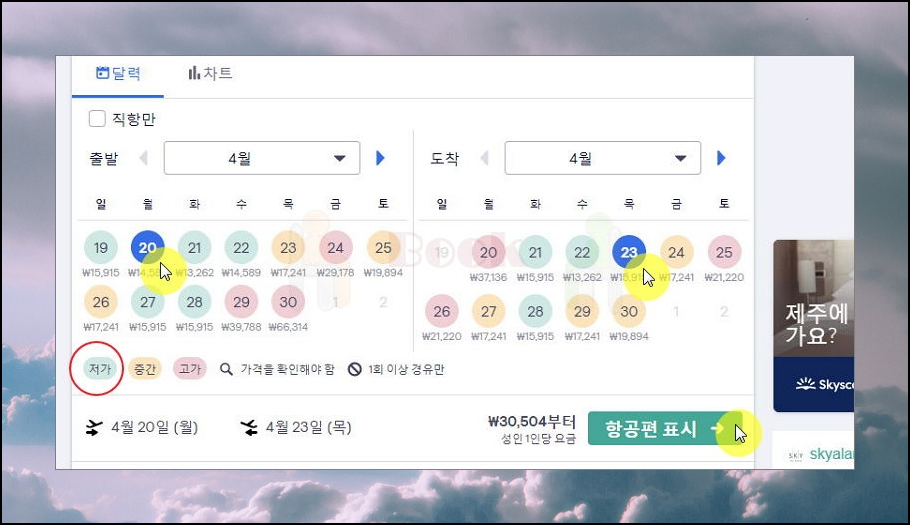 3. 한눈에 보는 가격 달력을 활용해보세요. [검색] 버튼을 클릭하면 달력 형식으로 된 가격표를 확인할 수 있어요. 제주로 가는 국내선 여객기 이용 요금인데요. 달력을 보면 색이 칠해져 있어요. 녹색은 저가, 노란색은 중간, 빨간색은 고가를 의미해요. 가급적 녹색 표시가 되어 있는 날짜를 선택하면 돼요. 여행 가능한 날을 참고하여 조절해 보세요.
