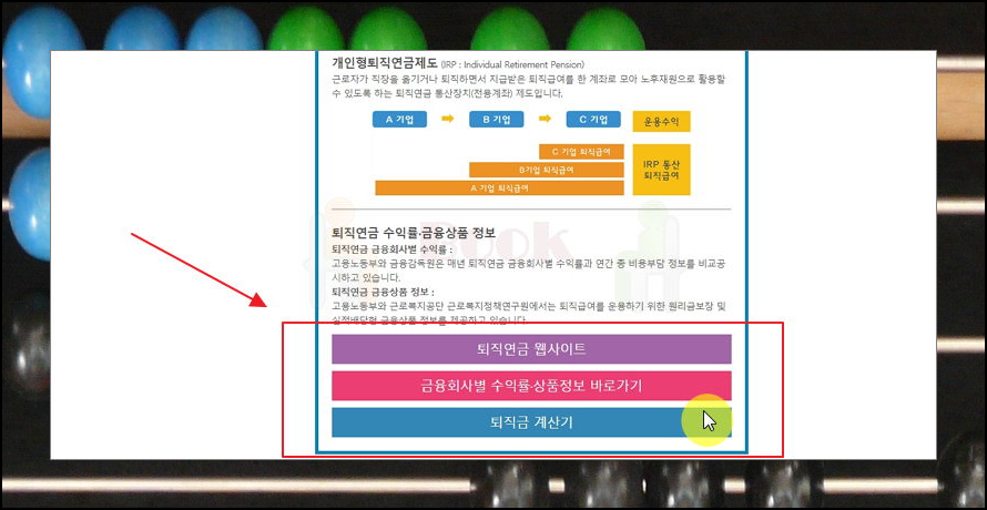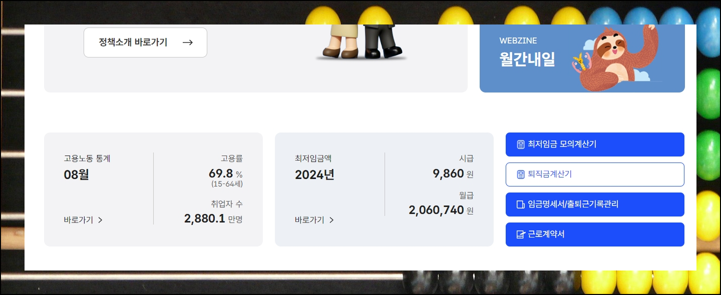2. 계산기 메뉴 버튼을 찾아봐요. 고용노동부 공식 홈페이지에 접속했는데요. 메인화면 우측 하단을 봐주세요. 여기를 보면 고용노동부 퇴직금 계산기 페이지를 열 수 있는 버튼이 있어요. 참고로 해당 페이지에서는 퇴직연금제도에 대한 설명도 나와 있으니 궁금하신 분들은 읽어보세요.
